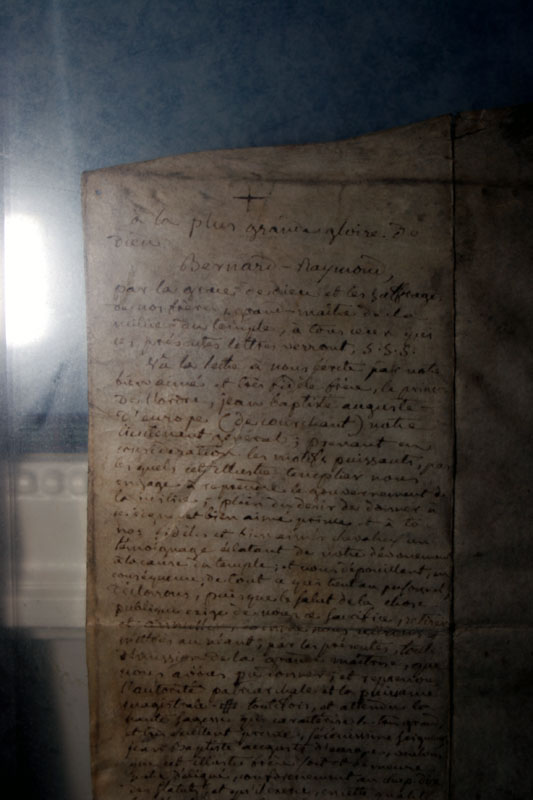 Ego frater Johannes Marcus Larmenius, hyerosolimitanus, Dei gratia et sacratissimo venerandi sanctissimique martyris, supremi templi militię magistri (cui honos et gloria) decreto, communi fratrum consilie confirmato, super universum templi ordinem, summo et supremo magisterio insignitus, singulis has decretales litteras visuris, salutem, salutem, salutem.